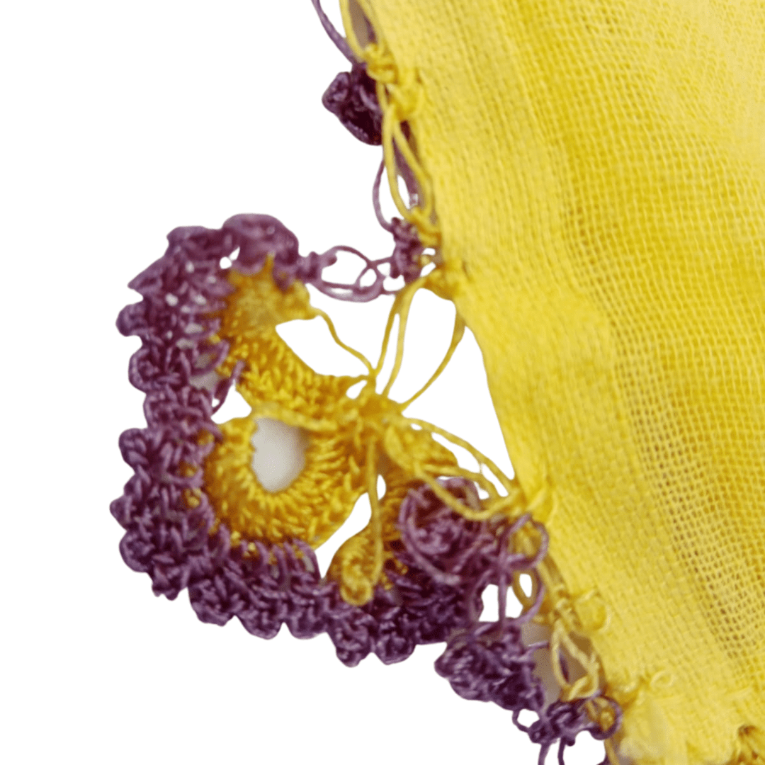 | Material | Pamuklu kumaş üzerine floş iplikle iğne oyası |