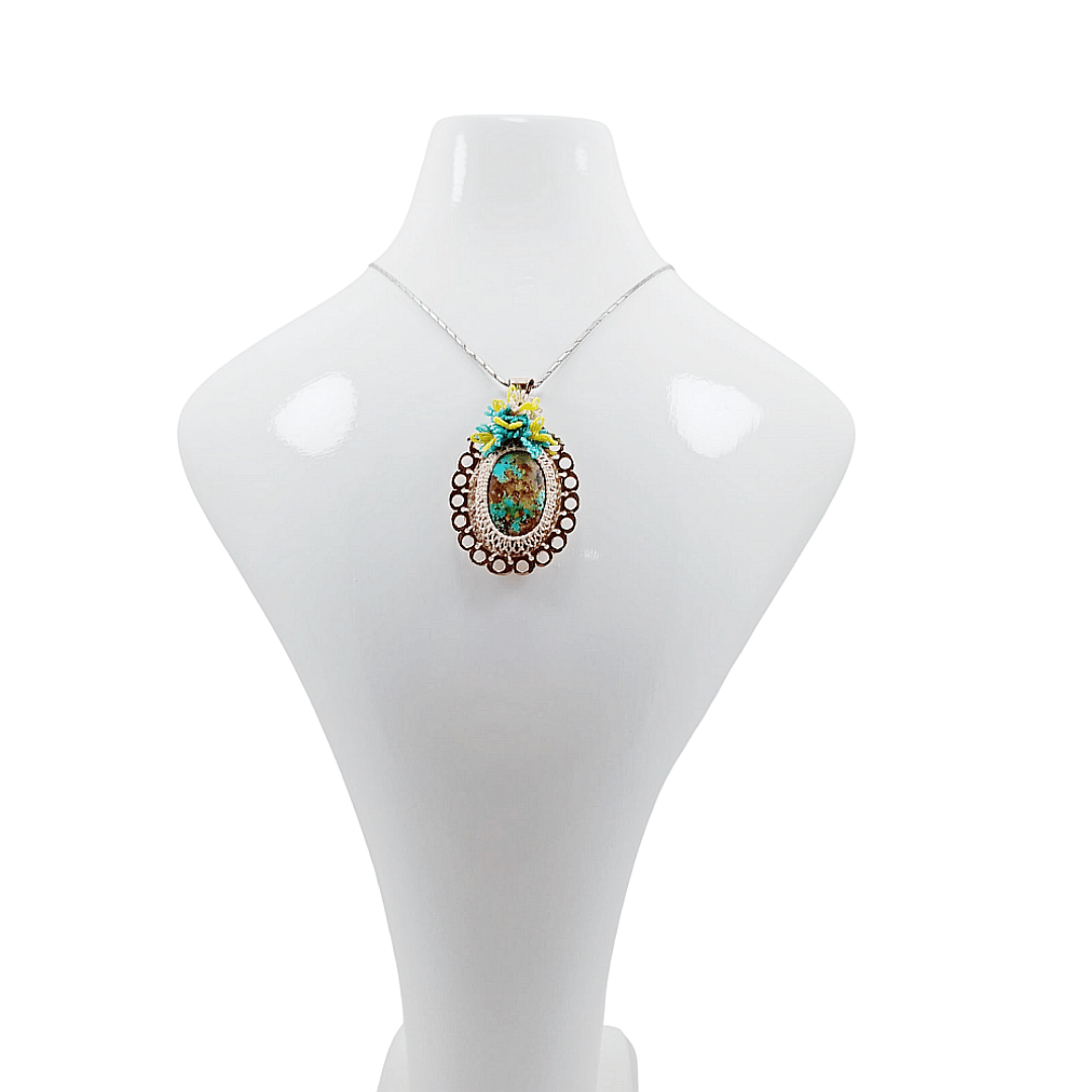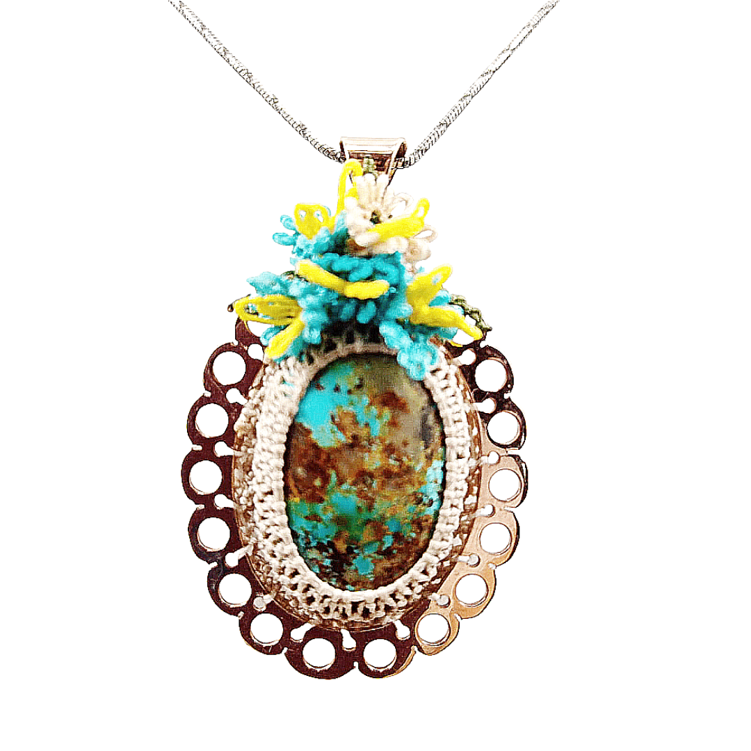 | Material | Gümüş çerçeve içine turkuaz taş ve iğne oyası |